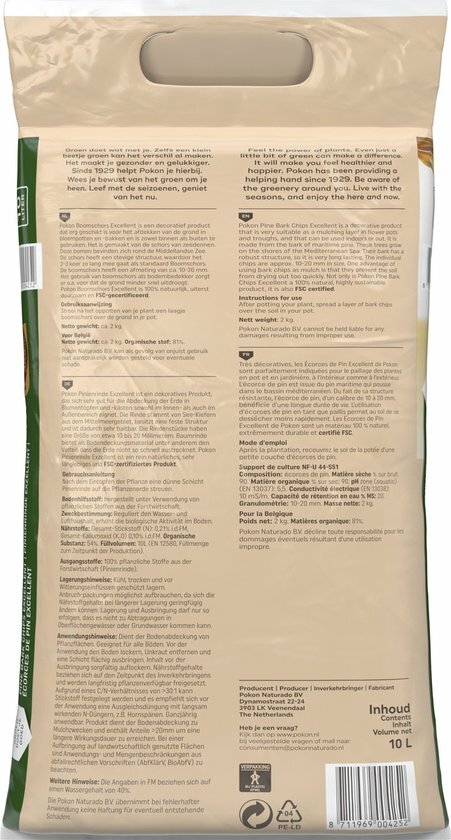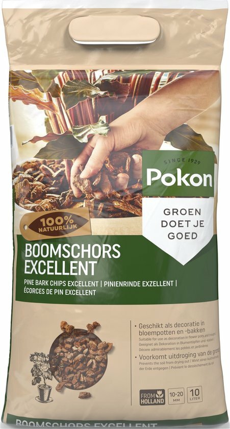 Pokon Boomschors Excellent 10L bevat relatief kleinere stukken boomschors dan de 40L variant. Deze Boomschors Excellent 10L is dan ook meer geschikt voor het afdekken van bloempotten en bloembakken. Het is een decoratieve laag die tegelijkertijd een vochtregulerende werking heeft. Dit betekent dat de grond minder snel zal uitdrogen.