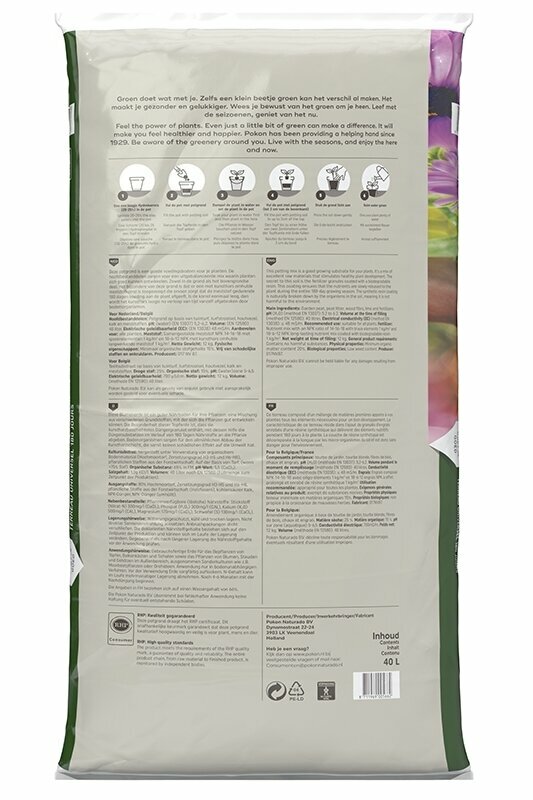 Pokon Potgrond Langwerkend is een goede voedingsbodem voor alle planten. De potgrond bevat uitsluitend hoogwaardige, natuurlijke grondstoffen, zoals turfstrooisel, tuinturf, kalk en meststoffen. Hierdoor wordt water goed vastgehouden en nemen planten de voeding goed op. Bovendien heeft Pokon een langwerkende meststof toegevoegd met voeding voor 6 maanden. Dit is een met kunsthars omhulde meststofkorrel die is toegevoegd en ervoor zorgt dat de meststof gedurende een heel groeiseizoen voeding aan de plant afgeeft. Is de korrel eenmaal leeg wordt het kunsthars laagje na verloop van tijd vanzelf afgebroken door bodemorganismen.