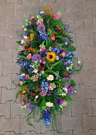 Dit rouwstuk wordt samengesteld en kan bestaan uit één bloemsoort of een combinatie van verschillende bloemen en kleuren. De afmetingen en prijzen vindt u hierboven. Heeft u specifieke wensen of wilt u een rouwstuk in een andere prijsklasse? Neem dan gerust contact met ons op, we helpen u graag verder.