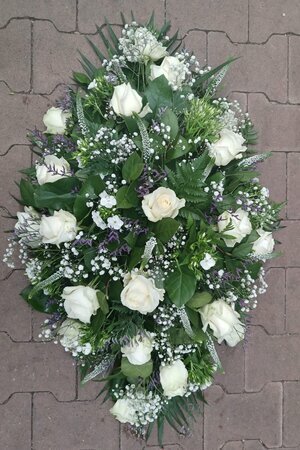 Dit rouwstuk wordt samengesteld en kan bestaan uit één bloemsoort of een combinatie van verschillende bloemen en kleuren. De afmetingen en prijzen vindt u hierboven. Heeft u specifieke wensen of wilt u een rouwstuk in een andere prijsklasse? Neem dan gerust contact met ons op, we helpen u graag verder.