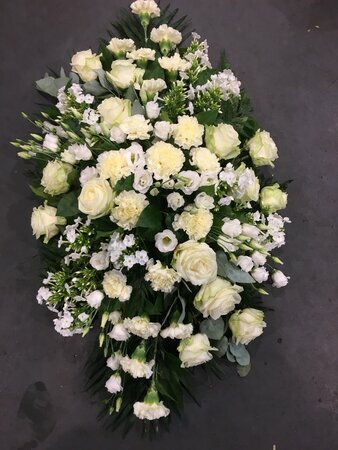 Dit rouwstuk wordt samengesteld en kan bestaan uit één bloemsoort of een combinatie van verschillende bloemen en kleuren. De afmetingen en prijzen vindt u hierboven. Heeft u specifieke wensen of wilt u een rouwstuk in een andere prijsklasse? Neem dan gerust contact met ons op, we helpen u graag verder.