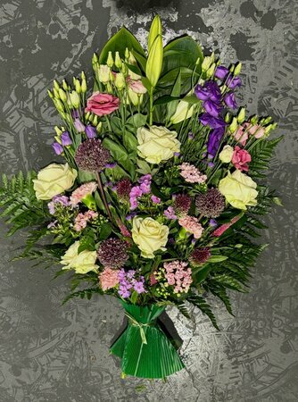 Dit rouwstuk wordt samengesteld en kan bestaan uit één bloemsoort of een combinatie van verschillende bloemen en kleuren. De afmetingen en prijzen vindt u hierboven. Heeft u specifieke wensen of wilt u een rouwstuk in een andere prijsklasse? Neem dan gerust contact met ons op, we helpen u graag verder.