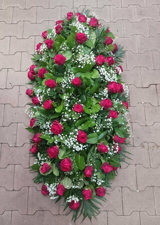 Dit rouwstuk wordt samengesteld en kan bestaan uit één bloemsoort of een combinatie van verschillende bloemen en kleuren. De afmetingen en prijzen vindt u hierboven. Heeft u specifieke wensen of wilt u een rouwstuk in een andere prijsklasse? Neem dan gerust contact met ons op, we helpen u graag verder.