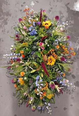 Dit rouwstuk wordt samengesteld en kan bestaan uit één bloemsoort of een combinatie van verschillende bloemen en kleuren. De afmetingen en prijzen vindt u hierboven. Heeft u specifieke wensen of wilt u een rouwstuk in een andere prijsklasse? Neem dan gerust contact met ons op, we helpen u graag verder.