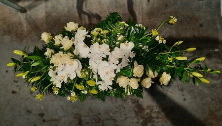 Dit rouwstuk wordt samengesteld en kan bestaan uit één bloemsoort of een combinatie van verschillende bloemen en kleuren. De afmetingen en prijzen vindt u hierboven. Heeft u specifieke wensen of wilt u een rouwstuk in een andere prijsklasse? Neem dan gerust contact met ons op, we helpen u graag verder.