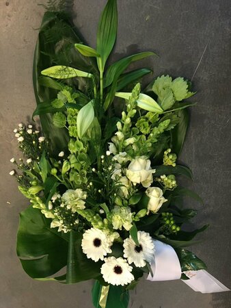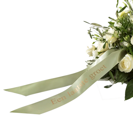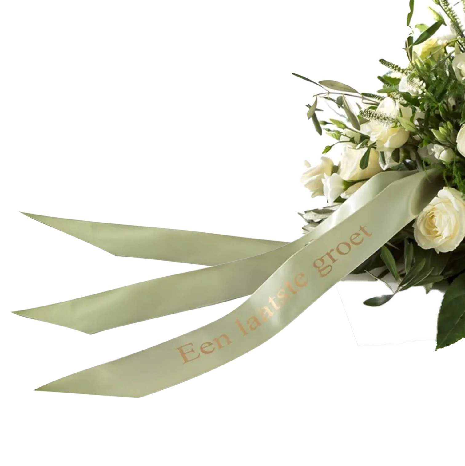 Rouwlint in drie delen, keuze uit de kleuren crème-wit, wit, donkergroen en olijfgroen. Keuze voor kleur en tekst worden gemaakt tijdens het afrekenen